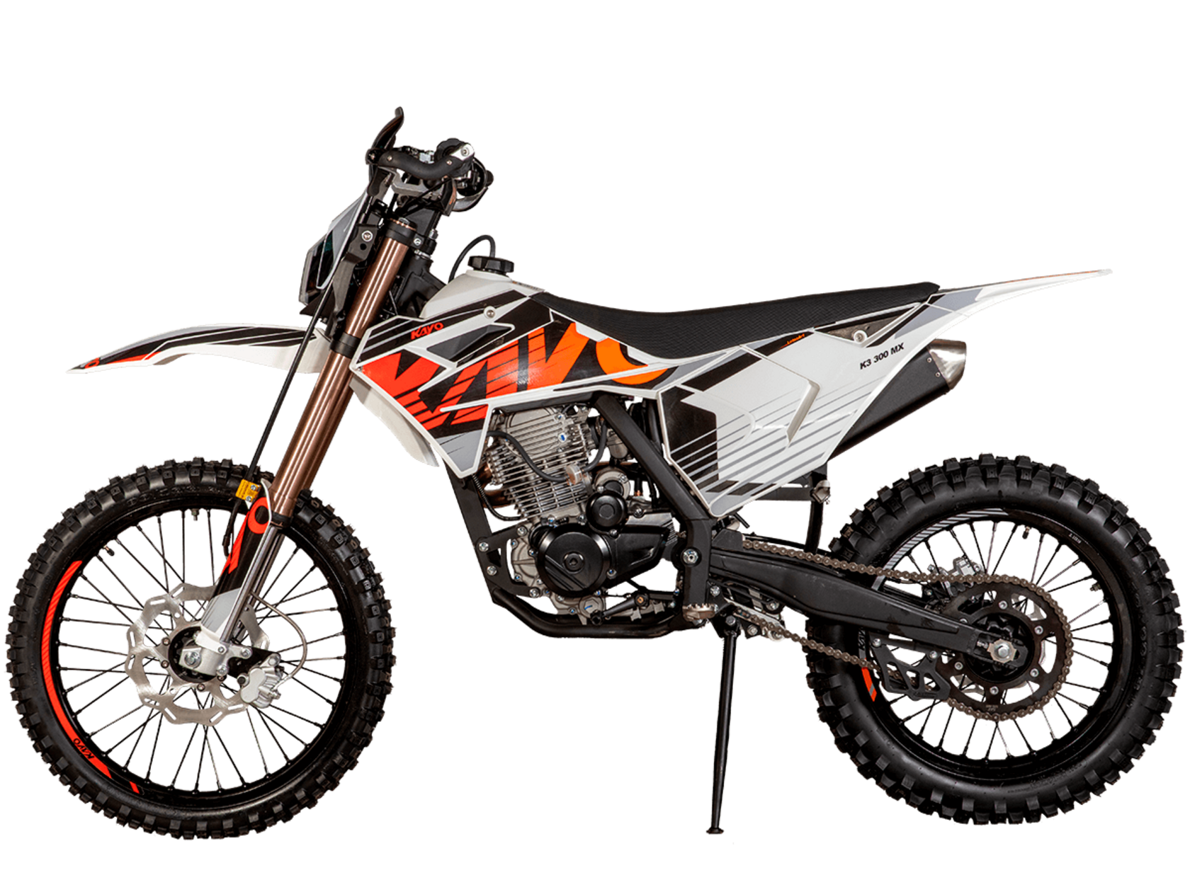 Мотоцикл KAYO K3 300 MX 21/18 2025 – эндуро мотоцикл, который пришёл, чтобы стать новым хитом среди среднеразмерных моделей!Мотоцикл оснащён одноцилиндровым 4-тактным двигателем ZONGSHEN PR300/ZS175FMM-5 объёмом 271,3 см³ с балансирным валом и воздушным типом охлаждения. Максимальная мощность в 21,75 л.с. достигается при 8500 об/мин, а максимальный крутящий момент 22 Нм при 6500 об/мин. Соотношение диаметра и хода поршня 75,0х61,4. Степень сжатия 9,29:1. Карбюратор NIBBI PE30 обеспечивает топливную экономность и бесперебойную работу в самых сложных заездах. На мотоцикле установлена 5-ступенчатая коробка передач и цепной привод. Запуск двигателя осуществляется с помочью электростартера или кикстартера. Объём топливного бака 10 литров.Спицованные колёса с алюминиевыми ободами имеют диаметр 21 дюйм спереди и 18 сзади. Для подвески спереди используется телескопическая вилка перевёрнутого типа длиной 830 мм, а сзади установлен моноамортизатор длиной 450 мм. Оба компонента регулируются. На мотоцикле установлены гидравлические дисковые тормоза с 2-поршневой системой спереди и однопоршневой сзади.Мотоцикл готов к самым суровым вызовам бездорожья. Удобное расположение фильтр-бокса позволяет легко обслуживать его после заездов. Руль оснащён алюминиевой защитой рук с высокими пластиковыми накладками. На мотоцикле используются ручки-«неломайки» с регулировкой положения рычага и короткоходная ручка газа.Габариты 2100х810х1180 мм, вес 109 кг. Клиренс 340 мм, колёсная база 1390 мм, высота по седлу 900 мм.