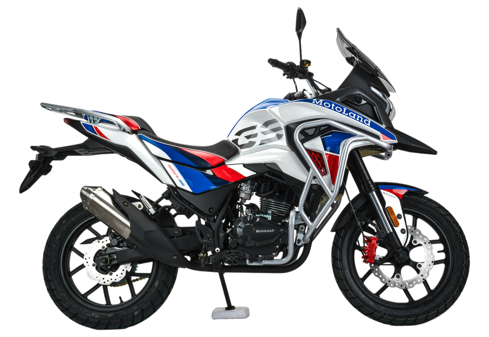 Motoland GS ENDURO является классическим турэндуро с укороченной колесной базой в размере 1330 мм. Он обладает вертикальным углом наклона вилки около 70 градусов и прямой посадкой, что делает его идеальным выбором как для начинающих райдеров, так и для опытных мото путешественников. Особенностью такой геометрии является легкость управления на низких скоростях. В сочетании с мощным двигателем ZS 175FMM-5 (PR300 с балансировкой), выдающим 25 лошадиных сил, мы получаем комфортный мотоцикл для городской езды и путешествий как по асфальту, так и по пересеченной местности.Мотоцикл Motoland GS ENDURO характеризуется своим ярким и узнаваемым дизайном, прочной рамой из Cro-mo труб, обладающей высокими прочностными характеристиками, а также современной подвеской с выносными регулировками компрессии и отскока. Он оснащен ободами из алюминиевого сплава, наличием электростартера, прямоточным выхлопом и LED оптикой с возможностью переключения между ближним и дальним светом.