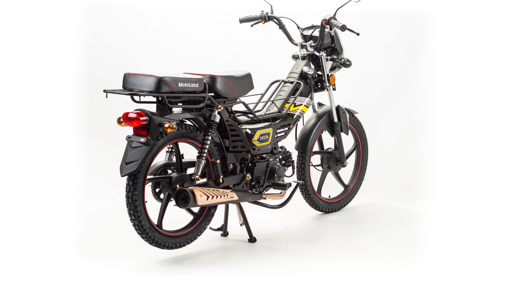 Мопед Motoland Дельта это всеми полюбившейся мопед который хорошо зарекомендовал себя на отечественном рынке. Выпускается в трех цветах: красный, синий, черныйМопед можно использовать для самых различных целей: для одиночного или совместного передвижения в городском потоке, сельской местности, поездки на природу, рыбалку и охотуПри этом он универсален и подходит мотолюбителям любого возраста,и опыта вождения.Для подростков, подойдет как подарок и первый мотоцикл для только начинающего свое знакомство с миром мототехникиВзрослых, которым нужна техника для поездок из точки А в точку Б и обратно, именно в таком режиме он способен показать себя с лучшей стороны.Мопед полностью отвечает требованиям к безопасному движению по городу и за городом: оснащен фарой дальнего и ближнего света, поворотниками, стоп-сигналом, звуковым сигналом, зеркалами заднего вида, габаритными светоотражателямиДля того чтобы ездить на мопеде, нет необходимости в регистрации в ГИБДД и страховке.Техническая сторонаМопед поставляется с 50 кубовым одноцилиндровым четырехтактным двигателем с воздушным охлаждением ZS50-A (1P39FMB).Установлен карбюратор PZ 19.Двигатель работает ровно, имеет высокую мощность в широком диапазоне оборотов, что позволяет комфортно трогаться и быть уверенным, что двигатель не заглохнет в неподходящий момент.Двигатель имеет возможность легкого запуска с кнопки на руле, так как имеет электростартер, а при необходимости можно воспользоваться кикстартером.Механическая трансмиссия содержит 4 передачиПри покупке мопеда, в подарок мы даем улучшенную поршневую.Мопед имеет хорошую динамику разгона, расход 1.6 л на 100 км, объем бака 3л, которого хватит на 200+кмПередняя подвеска телескопическая, с защитной гофрой.Задняя подвеска состоит из двух гидравлических амортизаторов, с прогрессивной пружинойВес мопеда 80 кг, выдерживает нагрузку до 150 кг.Колесные диски алюминиевые, размер колес — 17 дюймов (430 мм).Барабанные тормоза установлены на переднем и заднем колесе.На передней электромеханической приборной панели расположены спидометр,тахометр а также датчик включенной скорости