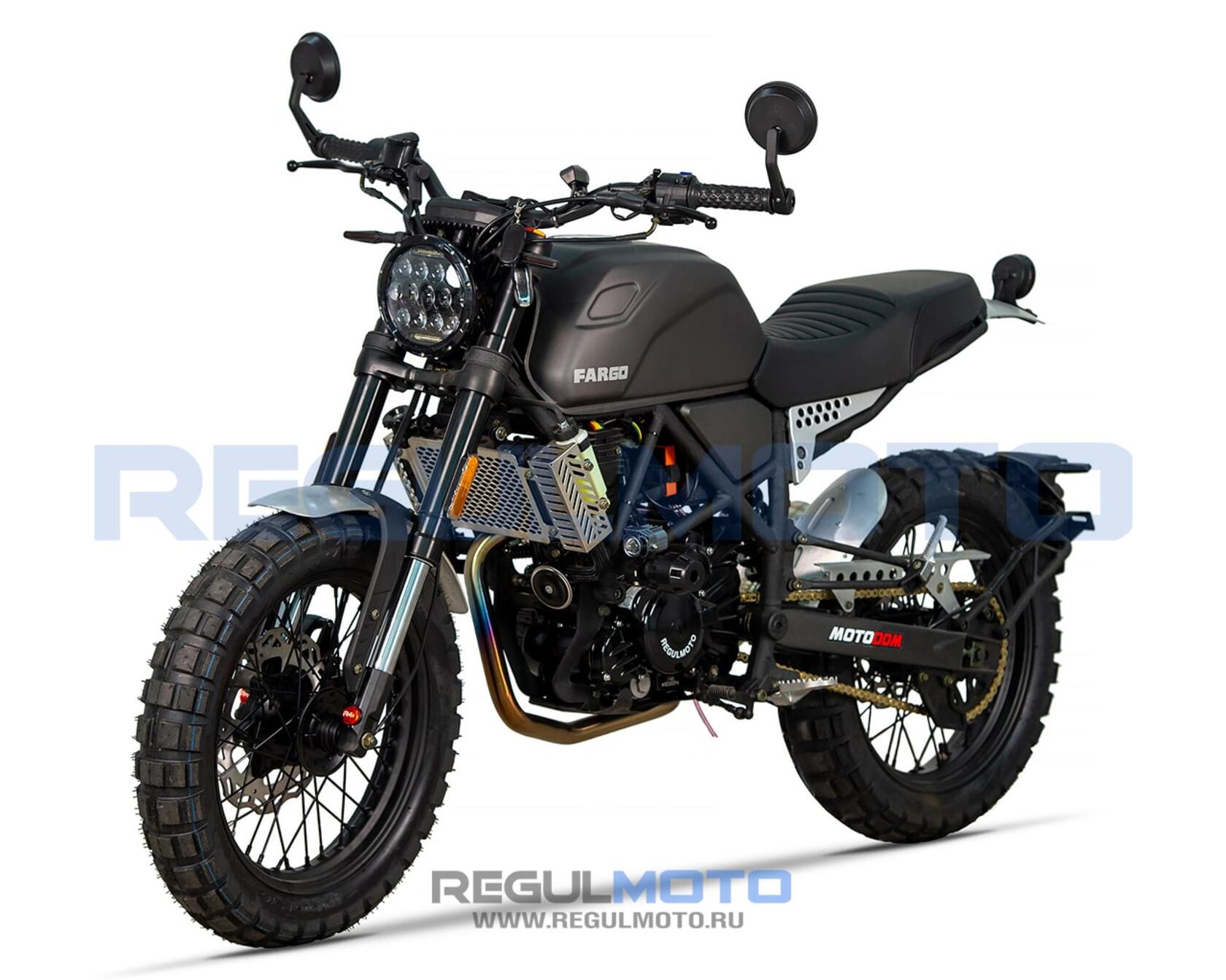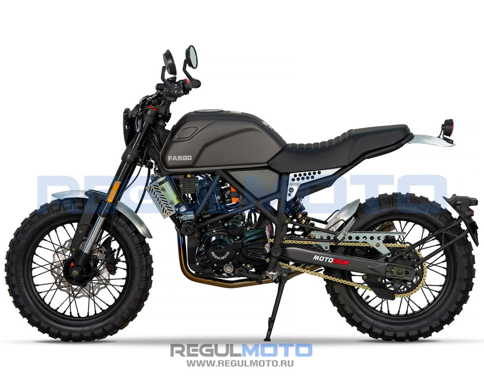 Regulmoto Fargo 300 новинка 2024 года!УправлениеУдобная прямая посадка позволяет как неспешно передвигаться, любуясь пейзажами, так и маневрировать на бездорожье или в городском потоке. Байк отличается послушностью, а тормоза обеспечивают замедление с любой скорости.Колеса и подвескаПередняя перевернутая вилка мягкая и плавная. Это позволяет преодолевать с комфортом даже самые «убитые» дороги. Задний моноамортизатор обеспечивает стабильность на бездорожье и в труднопроходимых местах.Колеса на Fargo 300 имеют эффектный внешний вид. Широкие шины с выраженным шипом обеспечивают отличное сцепление с любой поверхностью, а спицованные диски защищают байк от загрязнения и выхода из строя.ДвигательВ версии Regulmoto Fargo 300 используется двигатель от известного производителя Zongshen 174MM (CBS300) с водяным охлаждением и карбюратором Nibbi Racing PWK 34. Объединяя инновационные технологии и высокую производительность, он обеспечивает отличную динамику, экономичность и долговечность, делая каждую поездку ещё более впечатляющей.РамаРама Regulmoto Fargo 300 имеет классическую компоновку. Сварная штампованно-трубчатая конструкция имеет выверенный баланс между весом и жесткостью, что позволяет раме выдерживать высокие нагрузки и оставаться легкой.КППКороткие передачи 6-ступенчатой КПП хорошо зарекомендовали себя на бездорожье. Вместе с эластичным мотором они позволяют ровно двигаться без выкручивания газа до упора, а жидкостный радиатор охлаждения защищает мотор от перегрева.Regulmoto Fargo 300 — редкий случай, когда в одном мотоцикле идеально сочетается стиль и функциональность. Это настоящий скремблер — мотоцикл, построенный на базе лёгкого городского байка, приспособленного к передвижению вне дорог за счёт установки более длинноходных подвесок и внедорожных шин.При этом мотоцикл отлично вписывается в городской пейзаж, с лёгкостью преодолевает пробки, а за его пределами позволяет срезать путь, прохватив по грунтовкам.