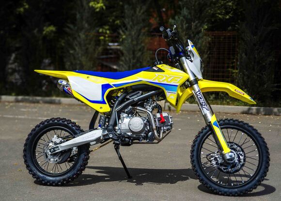Представляем Вам обновленный RXF Freeride 125 LE 17/14. Модель обзавелась фарой, электростартером и также получила обновленный дизайн графики.RXF Freeride 140 L – по праву считается отличным выбором из линейки Freeride. Мотор YX 125 с электростартером достаточно мощный и тяговитый, чтобы не дать скучать опытным райдерам, но в тоже время достаточно покладистый и безопасный для новичков. На обновленном Freeride теперь есть фара головного света, которая идет в комплекте с питбайком.