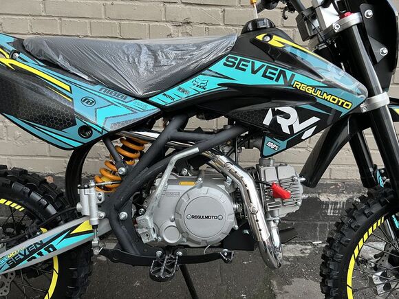 Представляем вниманию поклонников офф-роада и фри-райда питбайк Regulmoto Seven – новинку мототехники Regulmoto модельного ряда 2020 года. Regulmoto Seven – оптимальный выбор для райдера, который позволит своему владельцу совершенствовать навыки управления мототехникой на треке мотостадиона, а также получать максимальное удовольствие от офф-роад рейдов.В раме Regulmoto Seven установлен 125-кубовый 4-тактник YX с электростартером– этот двигатель отлично себя зарекомендовал в качестве надежного и простого силового агрегата. Подготовкой топливной смеси занимается карбюратор Nibbi PE19. Запуск мотора возможен как при помощи кнопки электростартера, так и привычной лапкой кика.Колеса питбайка размером 17/14 дюймов с усиленными алюминиевыми ободьями на 36 спиц «обуты» в качественную кроссовую моторезину Kenda. Установленные на колесах буксаторы предотвратят проворачивание покрышки и защитят камеры от возможных повреждений. Питбайк комплектуется фарой головного света; она включается при помощи поворота ключа в замке зажигания. В качестве элементов защитного обвеса используются пластиковые обтекатели типа CRF.Подбор комплектующих свидетельствует о полной готовности питбайка к покорению бездорожья. Среди стоковых компонентов мини-мотоцикла стоит отметить: