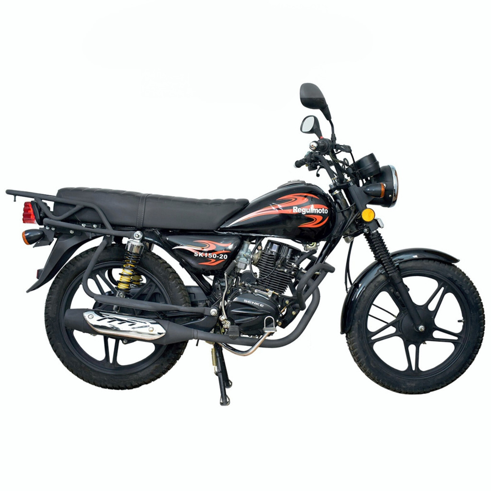 Мотоцикл Regulmoto SK 150-20 – еще один представитель линейки классических байков с малокубатурным двигателем, выпускаемый крупнейшим китайским производителем мототехники Senke. Кроме демократичной цены данный мотоцикл отличают высокая надежность узлов и агрегатов, простота повседневной эксплуатации и доступность компонентов, необходимых для сервисного обслуживания.В крепкой раме Regulmoto SK 150-20 установлен 4-тактный одноцилиндровый двигатель рабочим объемом в 150 см3 с воздушным охлаждением, который в паре с дроссельным карбюратором демонстрирует максимальную мощность чуть больше 12 лошадиных сил. Подвеска мотоцикла представлена телескопической вилкой спереди и маятником с двумя амортизаторами сзади.Вместительный бак, дуги безопасности, проверенные временем барабанные тормоза на переднем и заднем колесах, защитный кожух цепи, широкое и длинное сиденье и интегрированные в раму пассажирские подножки – все эти детали выдают утилитарное предназначение мотоцикла. Несмотря на классический «настрой», Regulmoto SK 150-20 отличается наличием массы актуальных решений: литые диски колес, современная приборная панель, световое оборудование на светодиодах, тумблер электростартера и остановки двигателя (кик-стартер также присутствует).Выбрав Regulmoto SK 150-20, вы получите надежный двухколесный транспорт на каждый день, который отличается превосходной управляемостью, высокой практичностью и простотой сервисного обслуживания без дорогостоящих вложений. Этот классический дорожник способен стать надежным партнером как опытному, так и начинающему мотоциклисту.